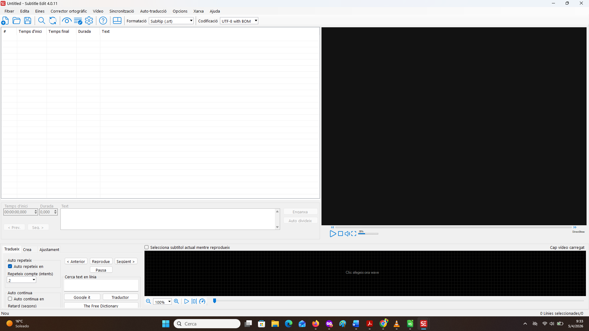 Editor de subtítols molt complet per a Windows, macOS i Linux. Té integració directa amb Whisper per generar subtítols automàticament a partir d’àudio o vídeo. Es pot baixar des de: